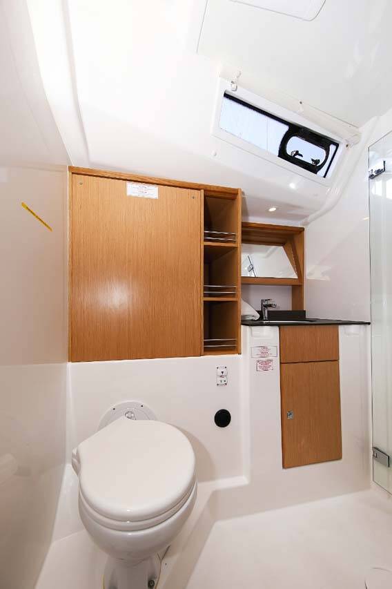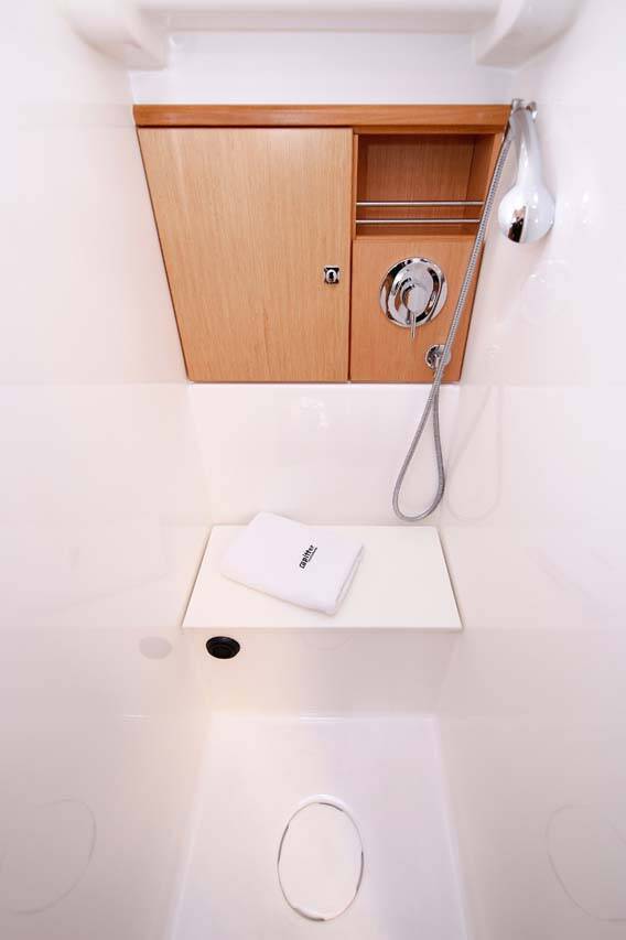 Anchor line Anchor swivel Bathing platform Bimini top Black ball Black conus Boat hook Bosun's chair (Safe seat) (boatswain's chair) Canister for water Cockpit table with light Cockpit/stern, outside shower Dinghy Dinghy (byboat) pump Electric anchor windlass Fenders Gangway Hawser Impeller, V-belt, oilfilter Jerry cans for diesel Main anchor Mooring ropes Plastic bucket Repair box for dinghy Round/globular fender Spare anchor (Reserve, Auxiliary anchor) Spotlight / Headlights Sprayhood Spring line Teak cockpit Teak deck Water hose