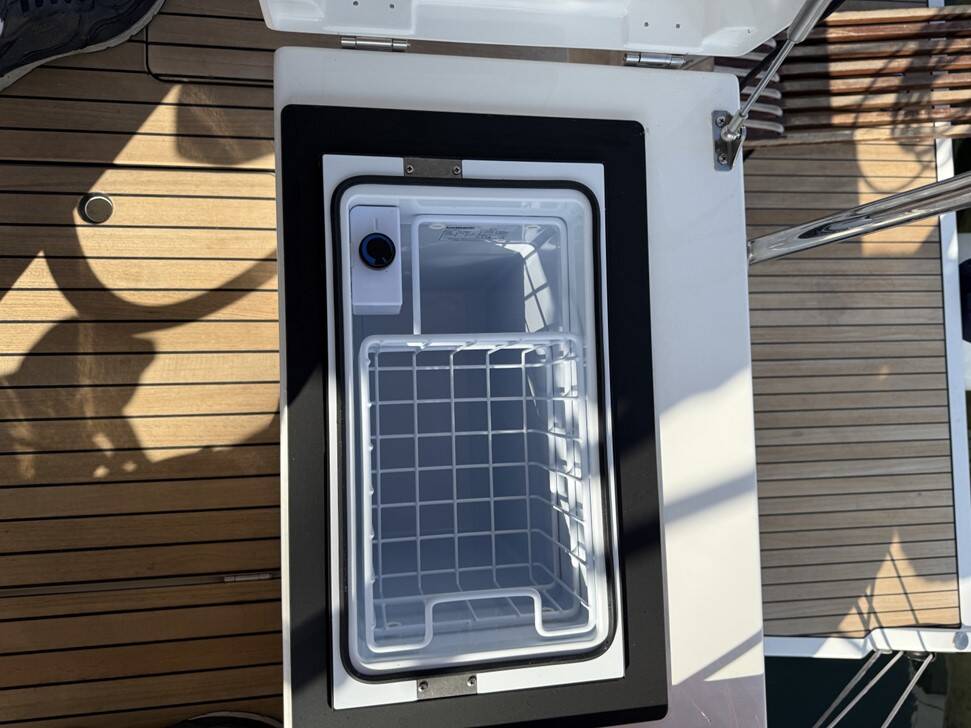 Anchor linea Anchor swivel Ancora principale Ausiliari di ancoraggio (Riserva di ancoraggio, ancora di rispetto) Barca gancio (mezzomarinaio) Black ball Black conus Canna d'acqua Cime di ormeggio Cockpit grill Davit Dinghy pompa (pompa aria) Doccetta esterna Gomena Impeller, V-belt, oilfilter Panchetta Parabordi Paraspruzzi Passerella Repair box for dinghy Riflettore (Faro) Round fender Secchio di plastica Springleine Tanica per gasolio Tanica per l'acqua Tavolo pozzetto Teak pozzetto Tendalino Tender Varricello Salpancore